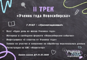 С декабря начался ПРИЕМ ЗАЯВОК на II трек (9-11 классы) XXIV городского конкурса "Ученик года Новосибирска"! Если ТЫ: активный, творческий, общительный, целеустремленный и самый-самый ученик образовательного учреждения Новосибирска, то скорее отправляй заявку и выставляй конкурсные задания на своей странице!