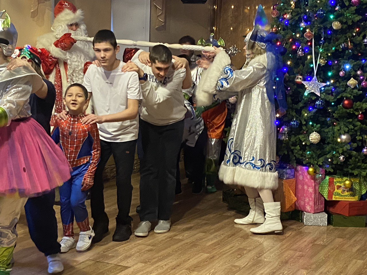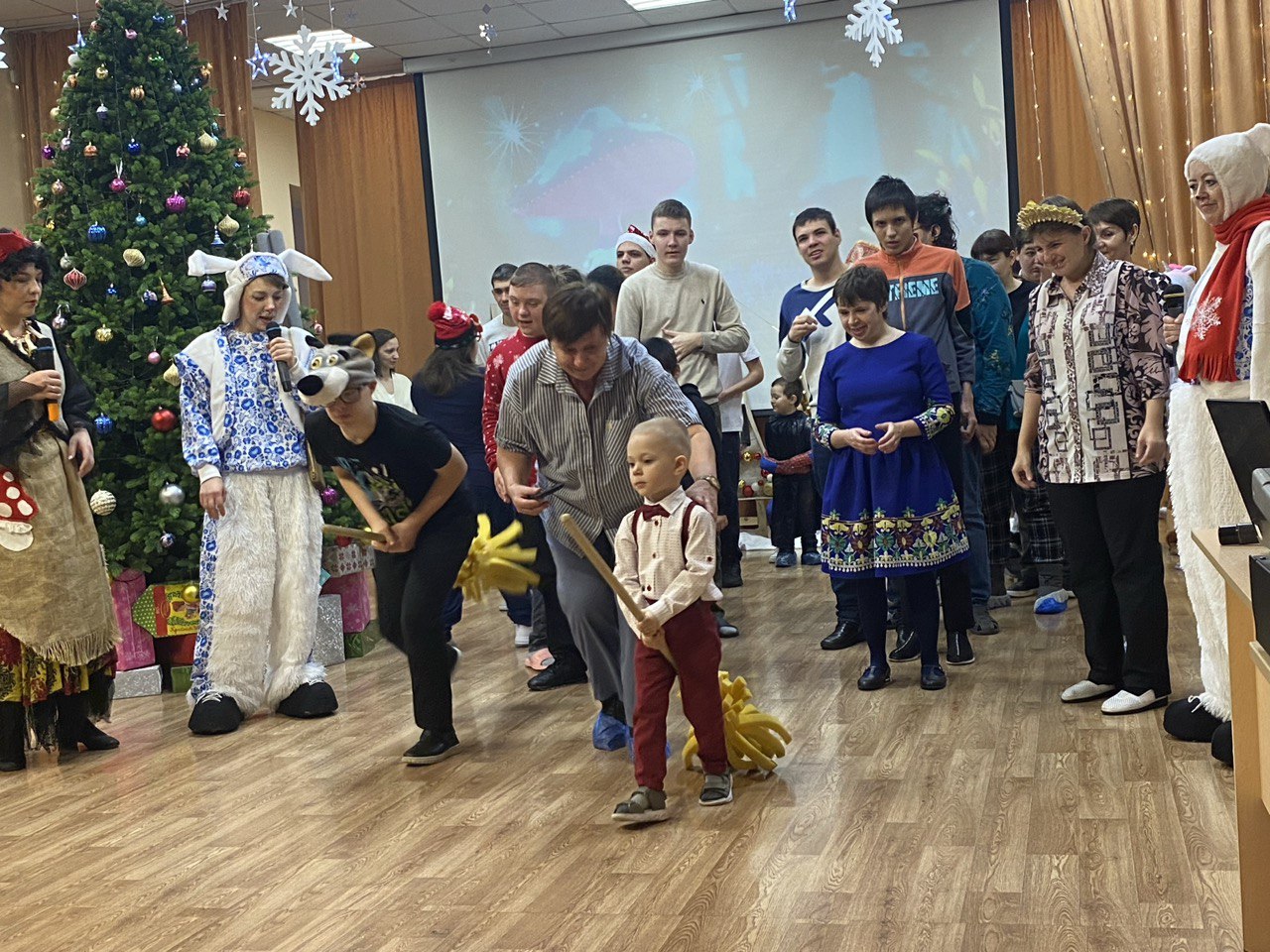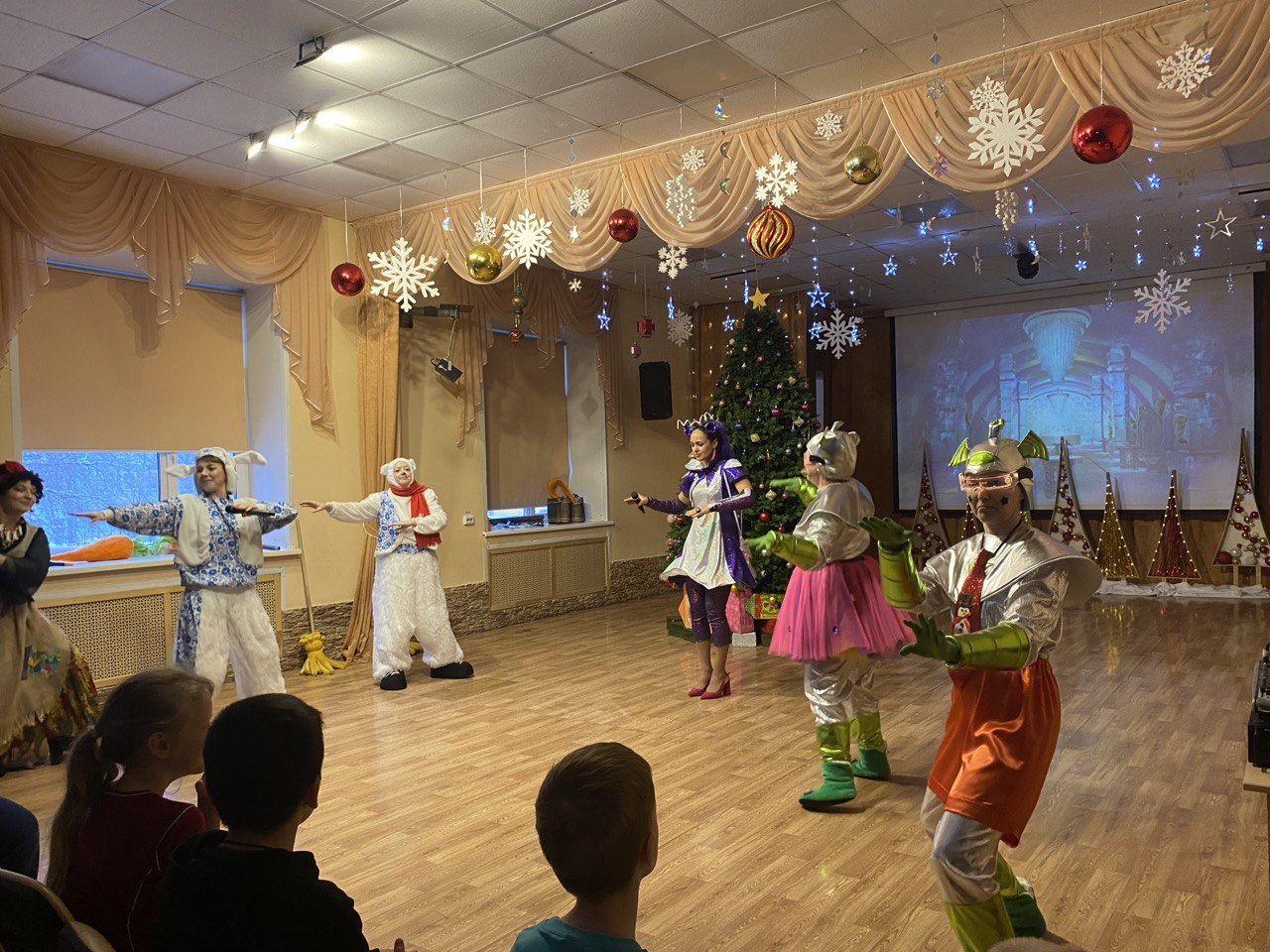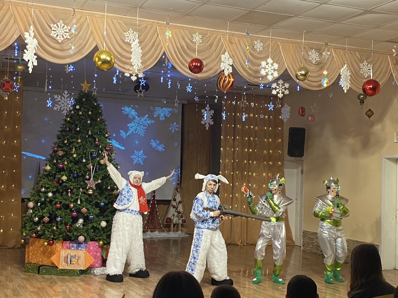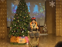 В этом году в новогоднем представлении зайчик и медвежонок защищали Полярную звезду от королевы и её помощников – Блистера и Бластера. Помогла им Баба Яга, вернувшая звезду на ёлку. Затем Дед Мороз и Снегурочка сняли заклятия со злодеев, и все герои вместе отпраздновали Новый год. Дети вместе со сказочными героями водили хороводы, танцевали, играли с Дедом Морозом и Снегурочкой в веселые игры, а после представления все получили подарки.