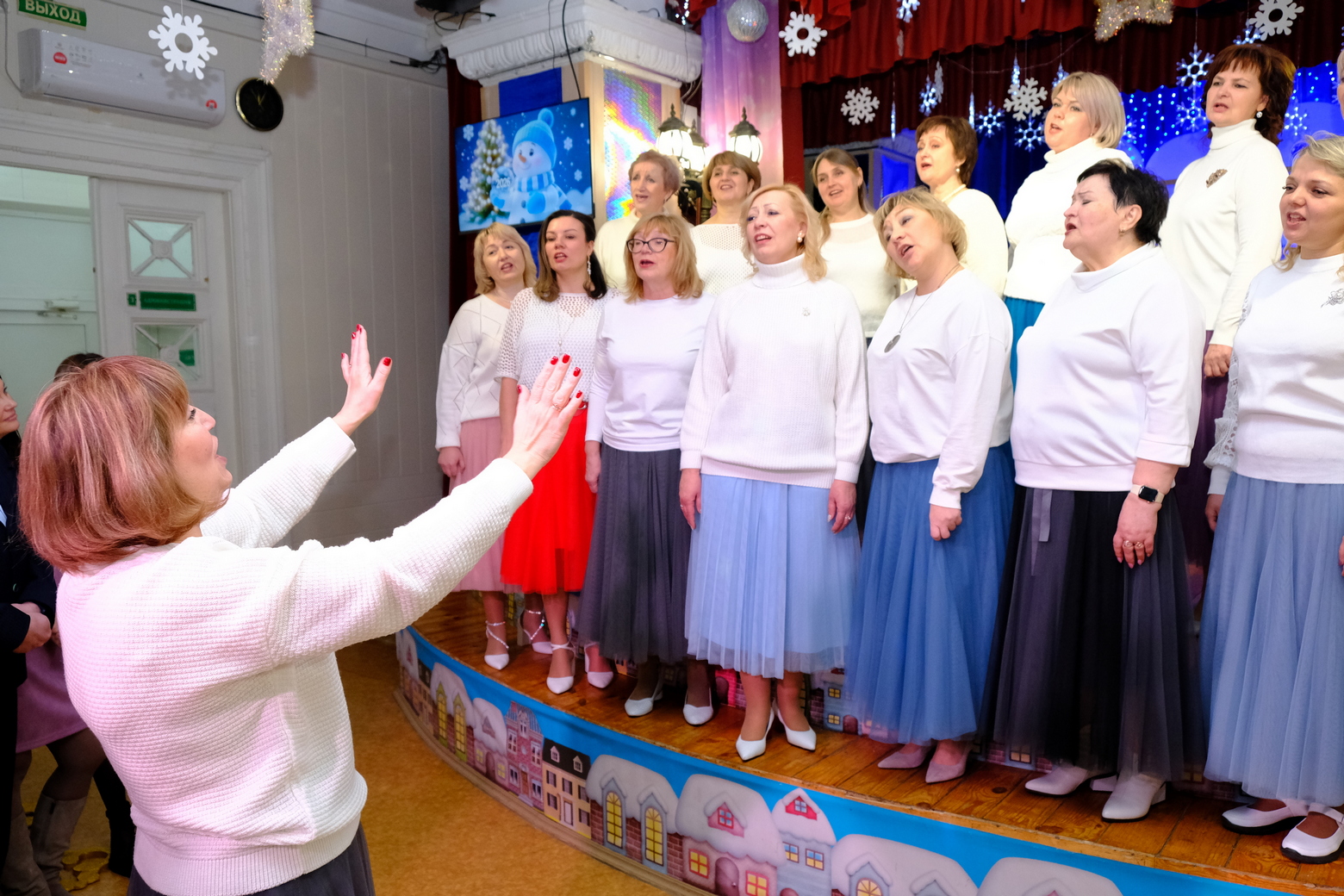 Выступил хор «КЛАССный руководитель». Коллектив возник как объединение директоров образовательных учреждений Ленинского района для подготовки совместного номера в рамках участия в фестивале творчества работников образовательных организаций Новосибирской области «Признание». Под руководством педагога Дома детского творчества им. В. Дубинина Оксаны Олеговны Безъязыковой участники хора исполнили для гостей песню «Три белых коня» из кинофильма «Чародеи» и песню «А снег идет».