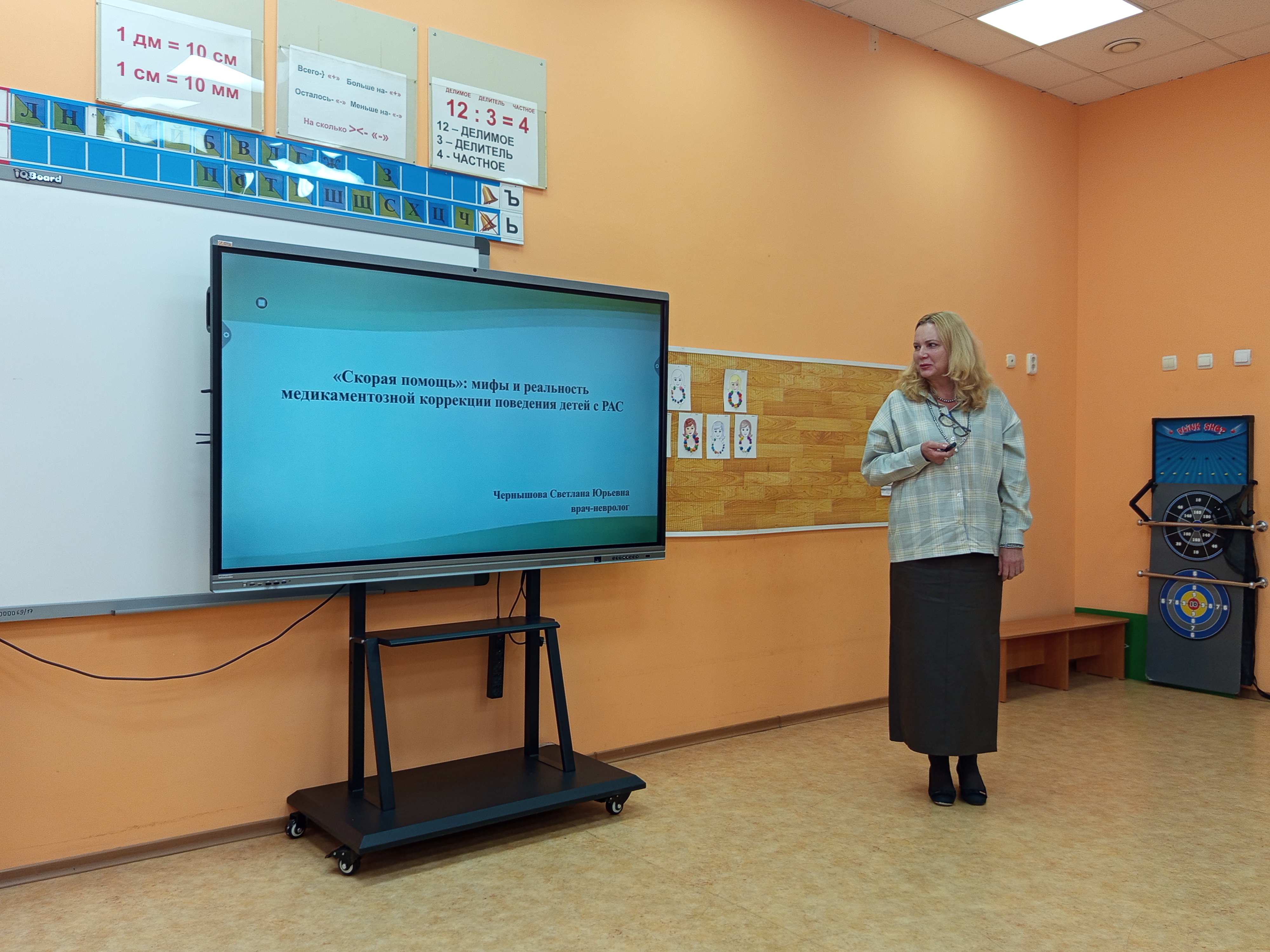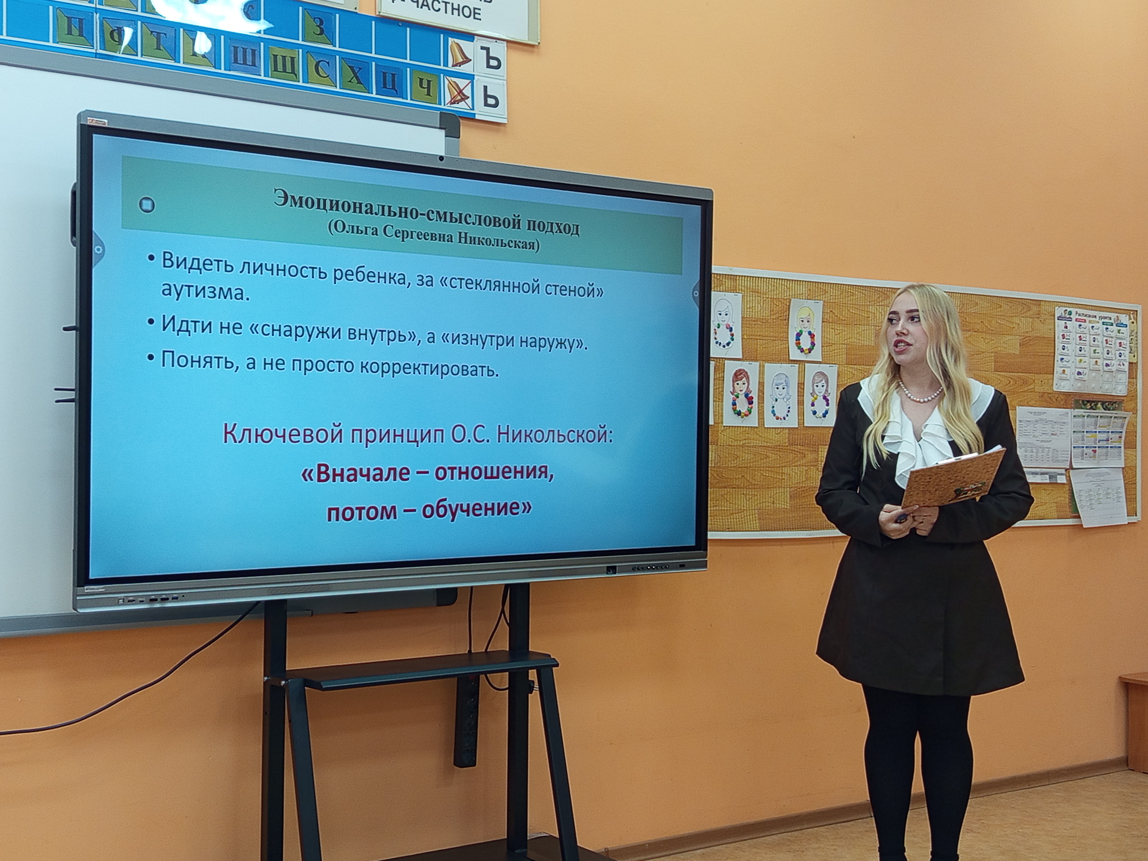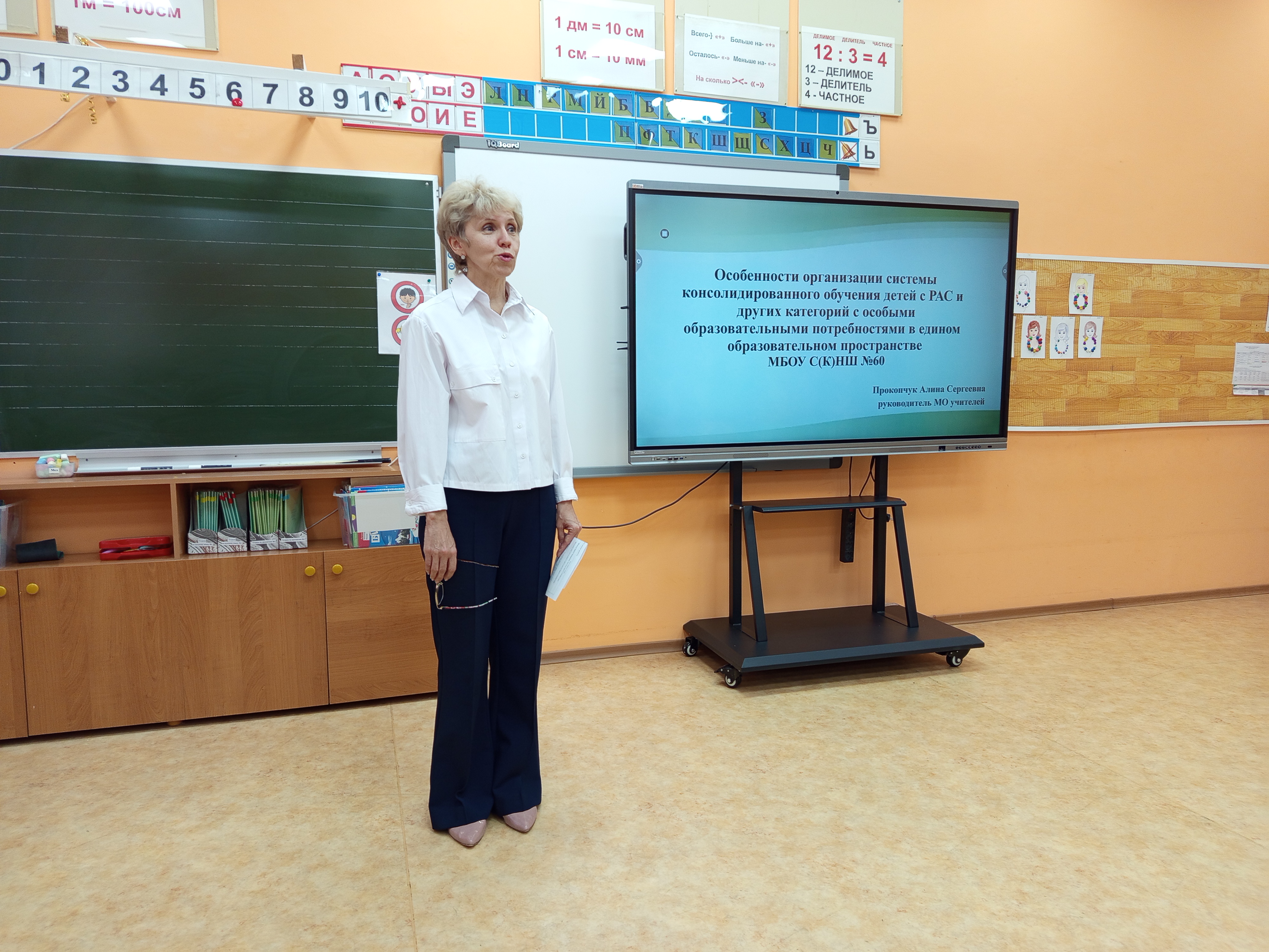 С приветственным словом к участникам семинара обратилась директор школы Л. А. Цыбаева. Руководитель методического объединения учителей А. С. Прокопчук рассказала об особенностях организации системы консолидированного обучения детей с РАС и других категорий с особыми образовательными потребностями в едином образовательном пространстве учреждения.