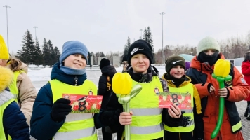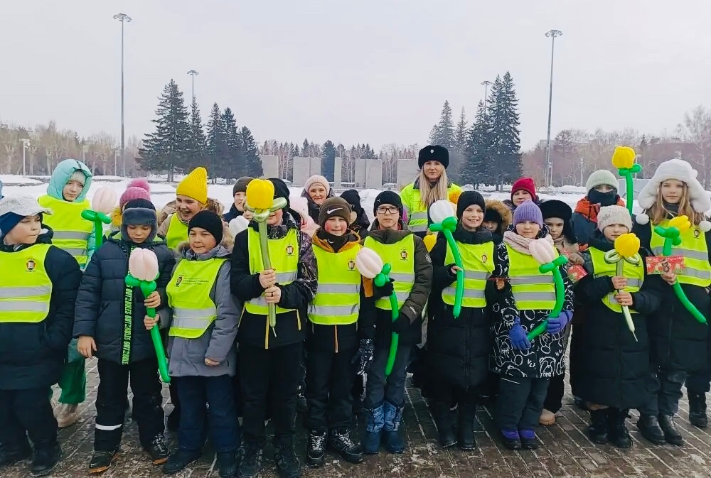 • Цветочная феерия на дороге: ученики школы № 73 поздравили автоледи с Днем 8 Марта