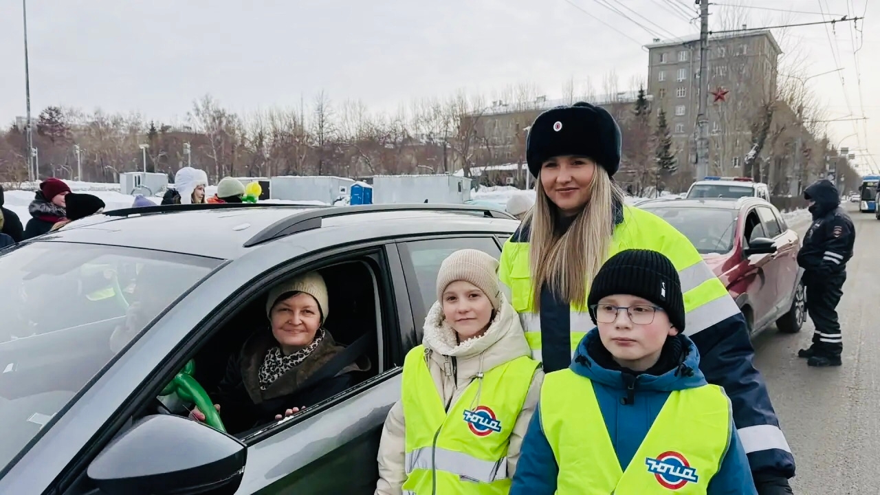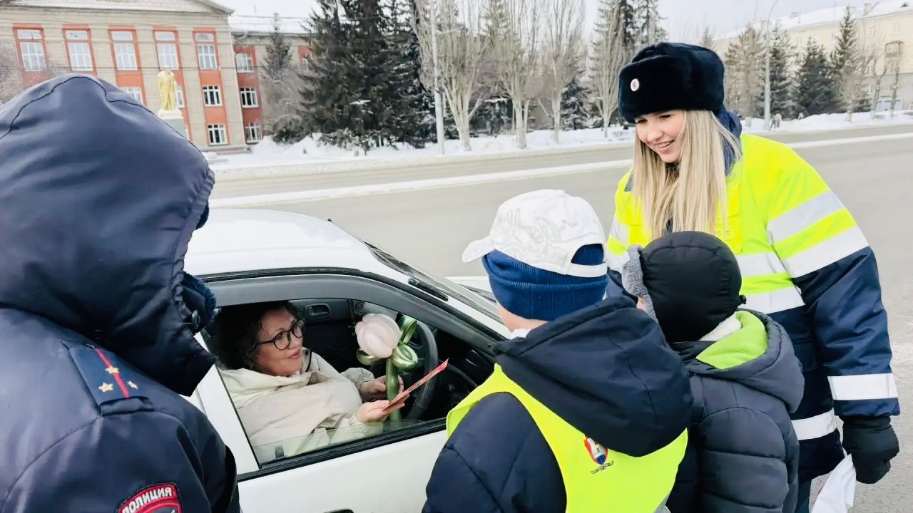 Цветочная феерия на дороге: ученики школы № 73 поздравили автоледи с Днем 8 Марта