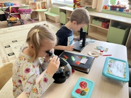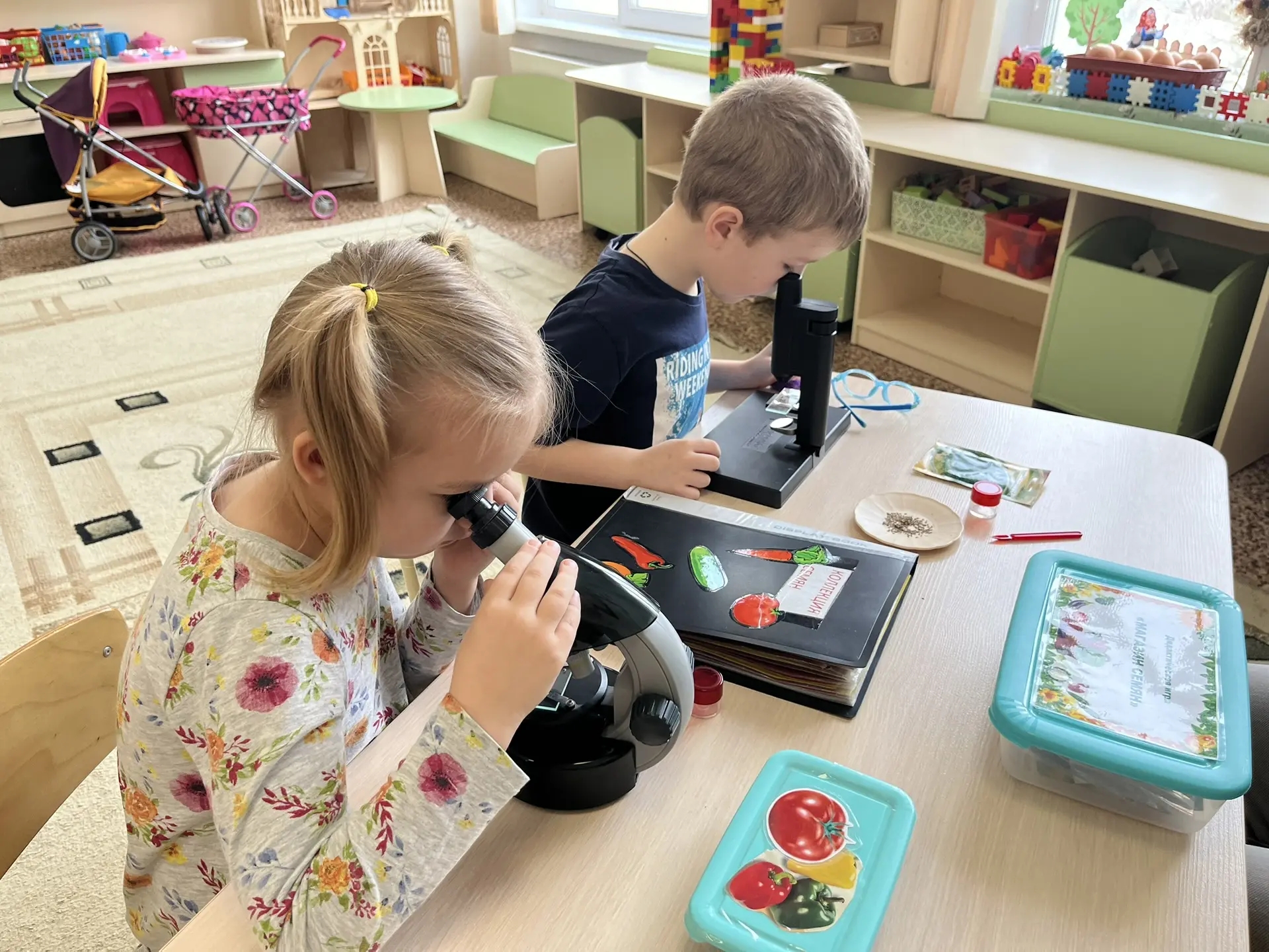 В специально организованной лаборатории дети изучали форму и строение семян разных растений, рассматривали через микроскоп семена укропа и петрушки, увидели их текстуру и особенности, которые не заметны невооружённым глазом.