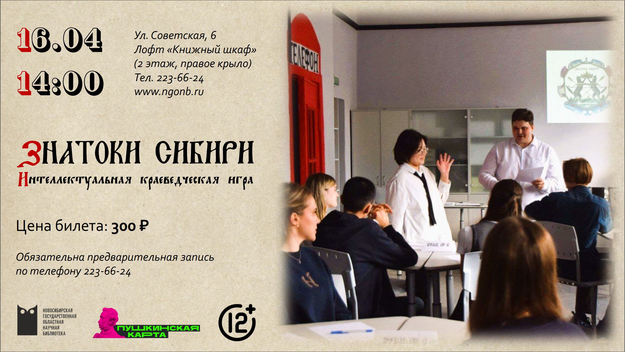 16 апреля в 14:00 Новосибирская государственная областная научная библиотека приглашает обладателей «Пушкинской карты» принять участие в интеллектуальной краеведческой игре «Знатоки Сибири».