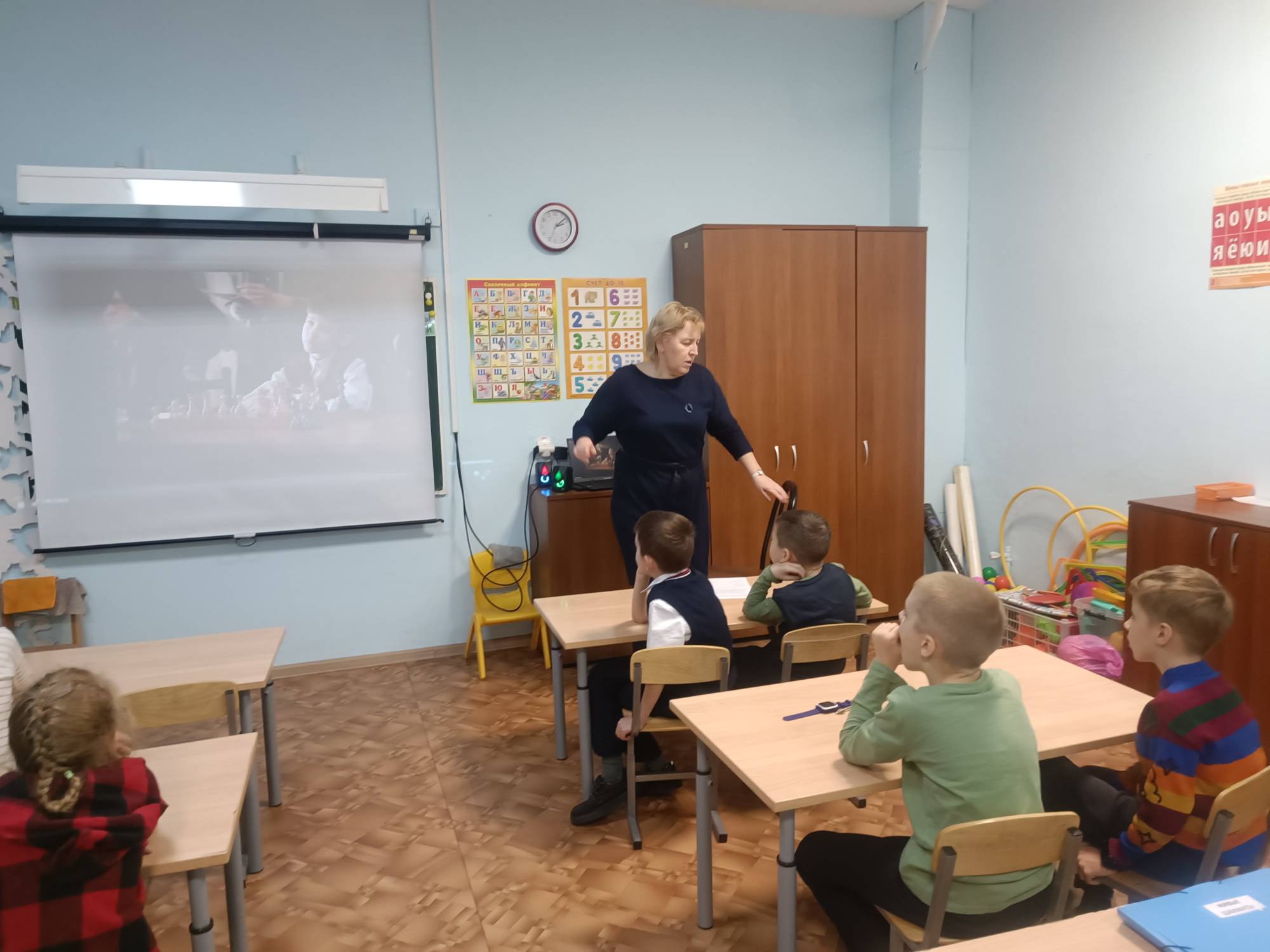 В начале программы Ирина Владимировна рассказала юным шахматистам, о том, как и когда был проведен первый шахматный турнир на звание Чемпиона мира и его первом обладателе – Вильгельме Стейнице. Ребята познакомились с выдающимися шахматистами: Эмануилом Ласкером, который удерживал титул чемпиона мира 27 лет, Александром Алехиным — единственным шахматистом, ушедшим из жизни, оставаясь действующим чемпионом мира, а также Гукешем Доммараджу — индийским гроссмейстером и самым молодым действующим чемпионом мира по шахматам. Учащиеся узнали о детстве этих спортсменов, их родителях, пути в шахматный спорт и первых победах.