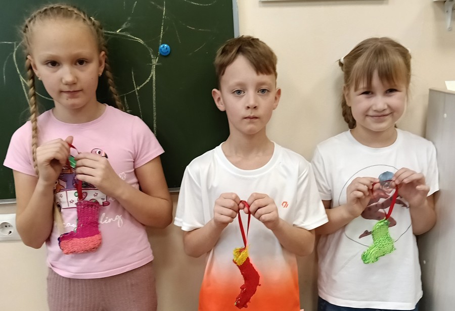 Изучив новую технологию и включив свою фантазию, юные художники Школы художественного творчества сплели гусениц, жуков, рыбок. Не оставили без внимания и зимних героев — снеговики примерили чудные шарфики. Сплели и новогодние носочки в надежде, что Дед Мороз или Снегурочка оставит в них маленький подарочек на новогодней ёлке. Изучать новые технологии всегда весело и интересно.