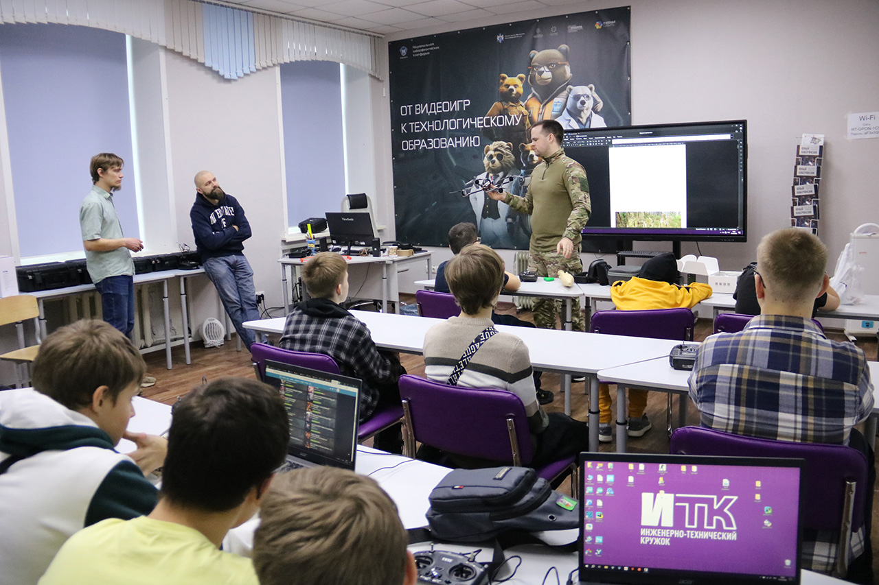 Второй мастер-класс провёл Ярослав Александрович Ломакин — ветеран СВО. Он сосредоточил внимание на вопросах военного применения БПЛА, распознавании потенциально опасных аппаратов и базовых способах защиты от них. Обсуждение строилось на примерах, близких к реальным условиям, что вызвало у учащихся живой интерес и активное участие в диалоге.
