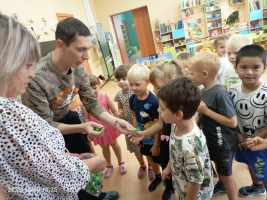 В детском саду № 105 сегодня суматоха: в гости пришел наш почетный гость – спецназовец Анатолий с позывным «Тайфун», с которым мы знакомы уже два года. Толик проходил лечение в горбольнице г. Новосибирска, перенес сложнейшие операции под руководством профессора Атаманова после тяжелейшей минно-взрывной травмы (при освобождении города Мариуполя штурмовая группа попала под минометный обстрел противника, вследствие чего Анатолий, закрыв собой 19-летнего сослуживца без бронежилета, принял весь удар на себя, получив очень тяжелое ранение. Впоследствии был награжден государственной медалью «За освобождение Мариуполя»).