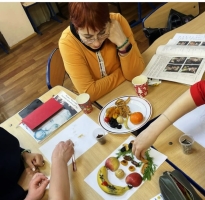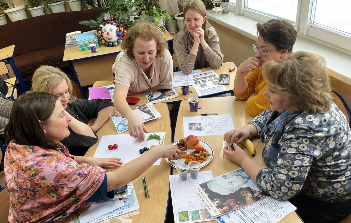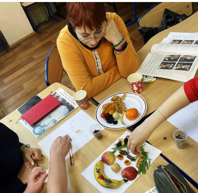 На мастер-классе «Вкусные картины и картины со вкусом» педагоги и воспитатели с помощью Дарьи Савченко и Светланы Шушаковой познакомились с творчеством итальянского художника Джузеппе Арчимбольдо. Именно он является автором оригинальных портретов, в которых лица людей составлены из фруктов, овощей и других предметов. Участники мероприятия сами создали несколько съедобных шедевров.