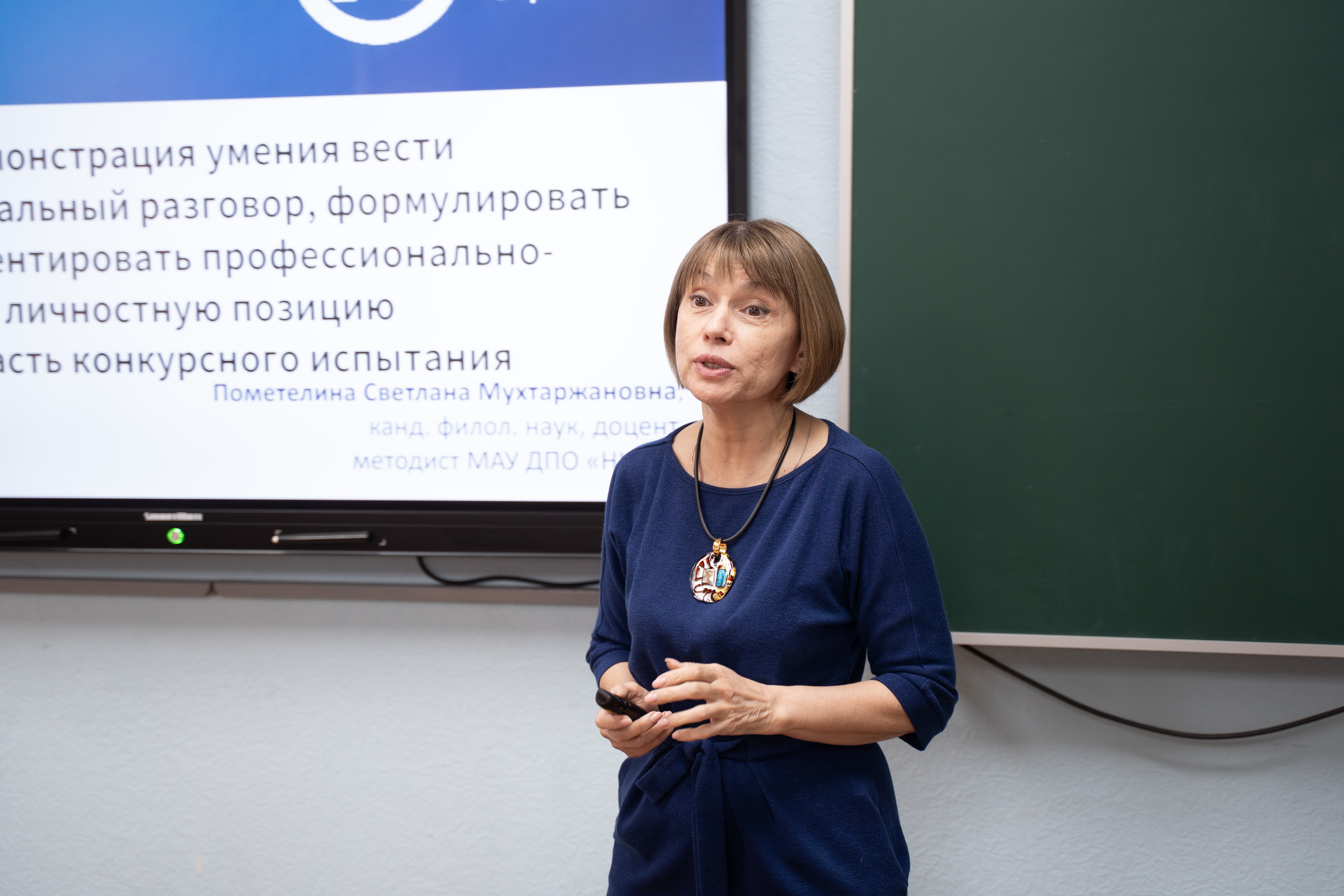 Методист МАУ ДПО «НИСО», к. филол. н. Пометелина Светлана Мухтаржановна рассказала о правилах ведения профессионального разговора, формулировании профессионально-личностной позиции в рамках конкурсных испытаний «Брифинг» и «Блицтурнир».
