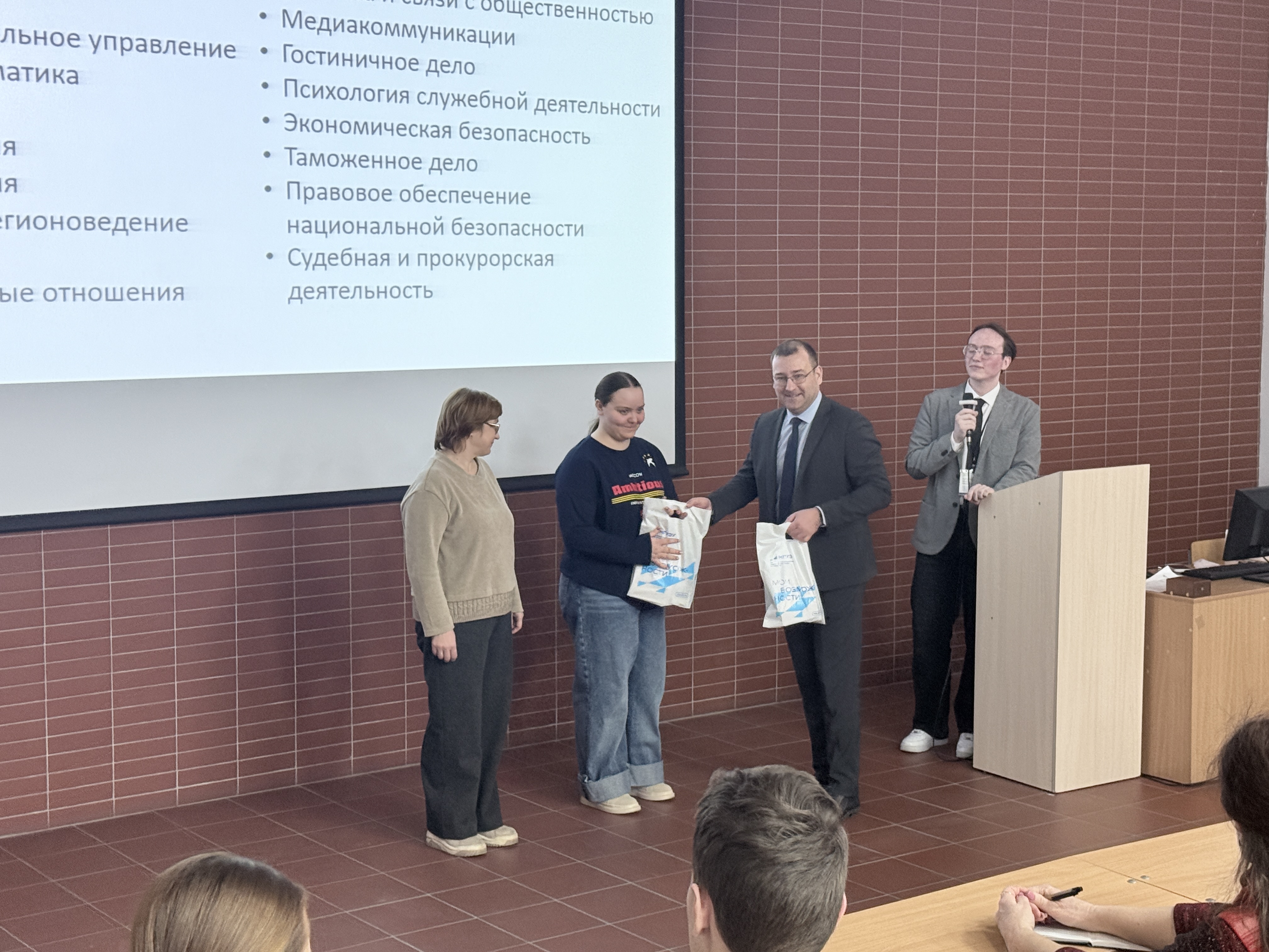 Будущих студентов приветствовал декан факультета «Корпоративной экономики и предпринимательства» НГУЭУ Ломоносов А. В. Присутствующим в зале Татьянам (и выпускникам, и их педагогам) Александр Викторович вручил памятные подарки, а все присутствующие выпускники получили информационные материалы о вузе.