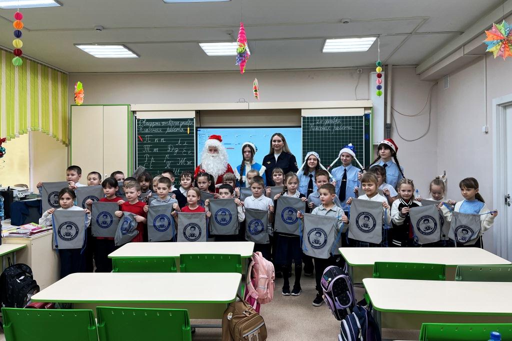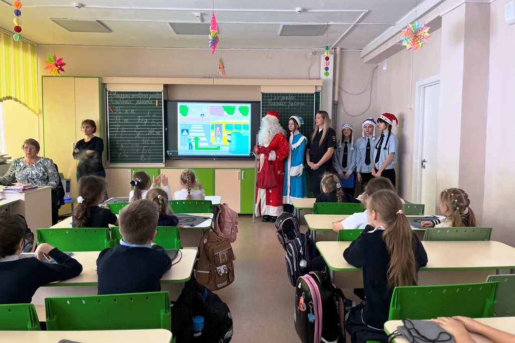 Ребята отряда ЮИД МБОУ СОШ № 56 Ленинского района г. Новосибирска вместе с Дедом Морозом посетили первоклашек. После новогодних пожеланий автоинспектор и «юидовцы» призвали юных участников дорожного движения к соблюдению ПДД, напомнили о важности использования световозвращающих элементов на одежде в темное время суток и в условиях, ограничивающих видимость.