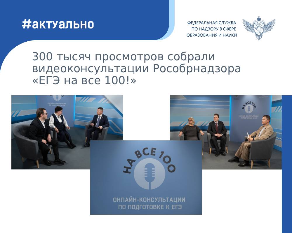 С 27 ноября по 24 декабря 2025 г. Рособрнадзор опубликовал цикл из 12 видеоконсультаций «ЕГЭ на все 100!». Они призваны помочь участникам ЕГЭ 2026 года подготовиться к экзаменам и уже собрали 300 тысяч просмотров.