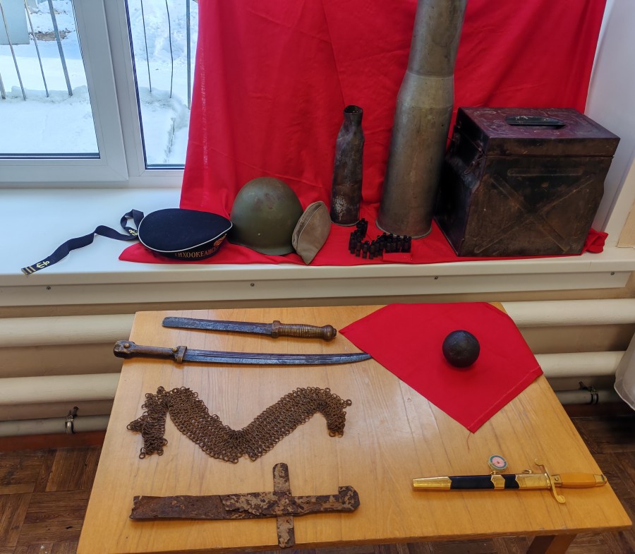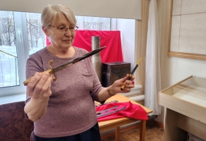 Первый раз из витрины было извлечено и пушечное ядро. Каждый раз, когда его брали в руки, раздавался возглас: «Тяжелое!». Затем настала очередь более поздних экспонатов — холодного оружия. Замечательно сохранившийся «Кинжал кривой солдатский» образца 1907 года и фрагмент «Тесака саперного солдатского», на эфесе которого выбита дата 1855 год.  Его ребята рассматривали с особым интересом, задавали различные вопросы. Вздох восхищения раздался, когда из ножен был извлечен морской кортик, бывший частью парадной формы морского офицера. Его сияние и острота произвели на ребят большое впечатление.